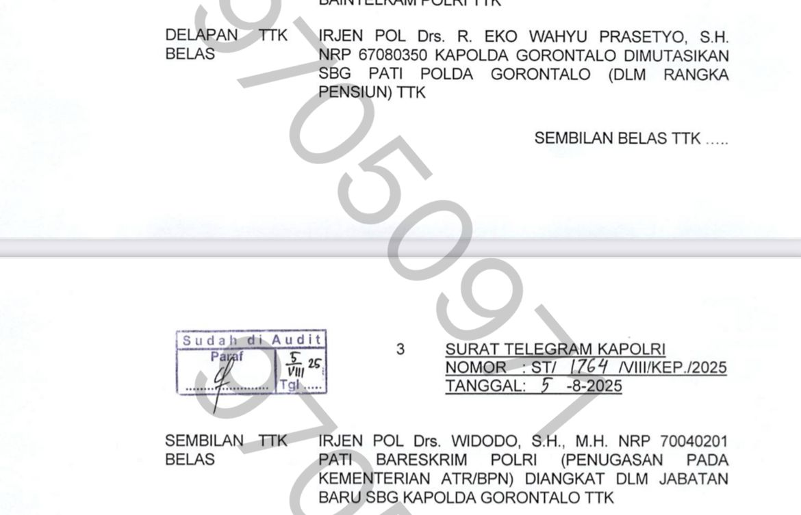 Pergantian tersebut tertuang dalam Surat Telegram Kapolri bernomor: ST/1764/VIII/KEP./2025 tertanggal 5 Agustus 2025, yang ditandatangani oleh Asisten Sumber Daya Manusia (AS SDM) Kapolri, Irjen Anwar.