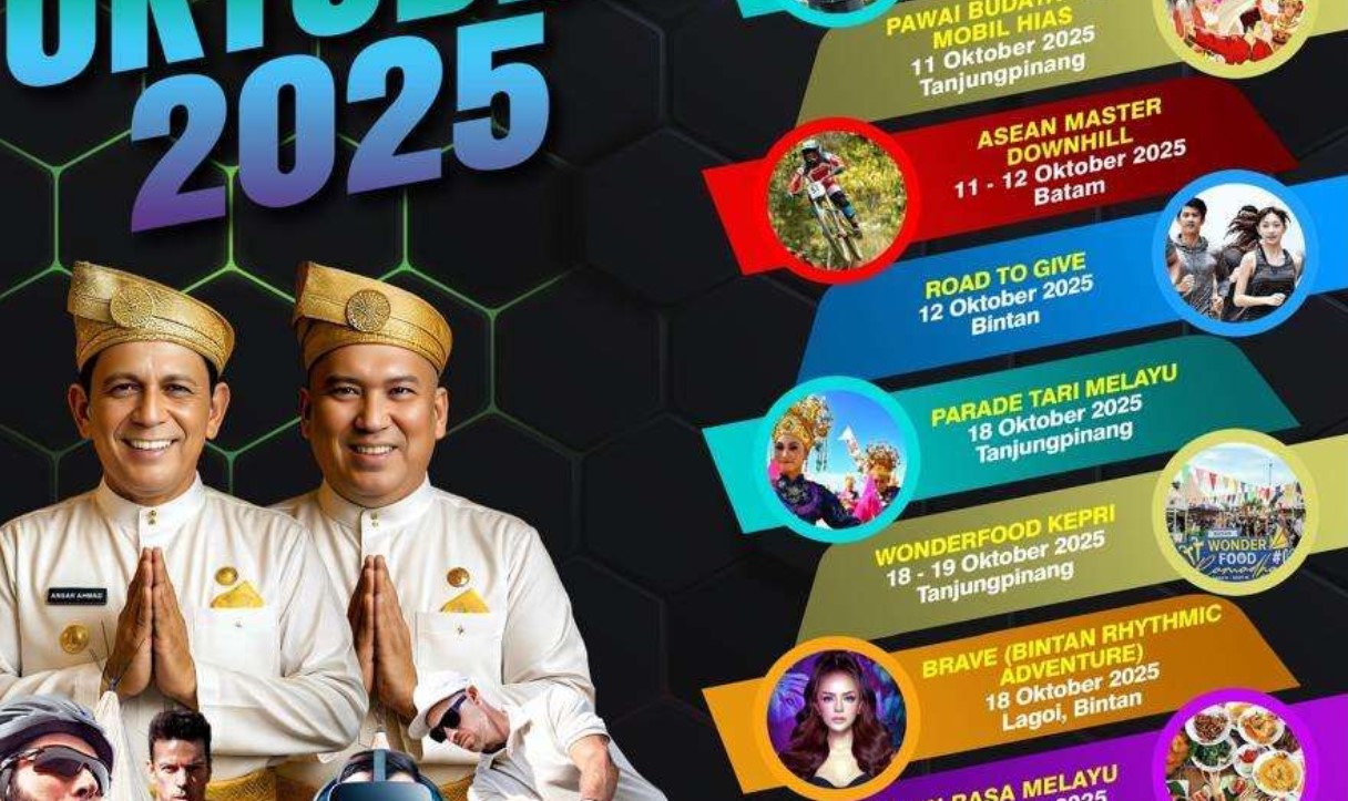 ULANDA.ID – Dinas Pariwisata Provinsi Kepulauan Riau (Kepri) meluncurkan 14 event pariwisata yang digelar sepanjang Oktober 2025. Agenda tersebut meliputi promosi budaya, olahraga, kuliner, wisata alam, hingga kegiatan amal yang tersebar di berbagai kabupaten dan kota.